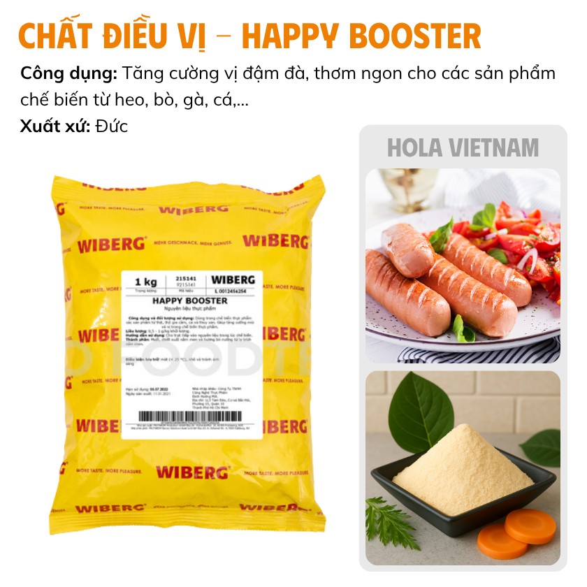 Chất điều vị – Happy Booster là sản phẩm cao cấp đến từ thương hiệu uy tín Wiberg – CHLB Đức, được thiết kế đặc biệt để nâng tầm hương vị cho các sản phẩm thịt chế biến. Với thành phần chính từ chiết xuất nấm men tự nhiên và hương bò nướng trích ly từ nấm men, kết hợp cùng muối, sản phẩm mang đến khả năng tăng cường vị đậm đà và hương thơm hấp dẫn cho các món ăn chế biến từ thịt heo, bò, gà, cá.
